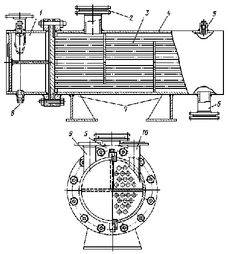 1 - водяная камера; 2 - подвод выпара; 3 - трубная система; 4 - корпус; 5 – отвод парогазовой смеси; 6 – слив конденсата; 7 - опоры; 8 - дренаж; 9 - отвод охлаждающей воды; 10 – подвод охлаждающей воды.